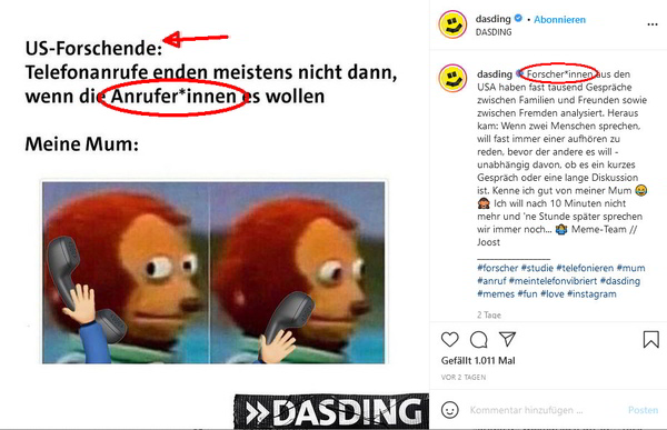 Das Team des Instagram Accounts von DASDING, das junge Angebot des Südwestrundfunks (SWR), nutzte am 4.3.2021 das Gendersternchen. Wir haben außerdem auch ein Partizip als Ersatz für das Wort „Forscher“ entdeckt:
