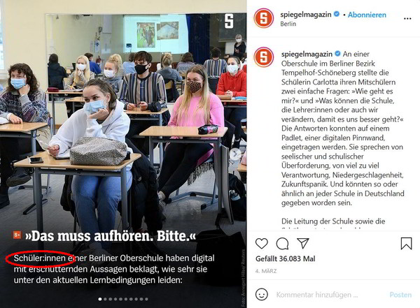 Selbst auf dem Instagram-Kanal vom Magazin Der Spiegel finden sich hier und da Genderzeichen – wenn auch eher selten, so wie hier am 15.3.2021: