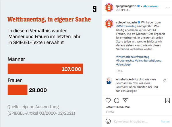 Der Spiegel – bekannt für den Slogan „Sagen was ist“, hat kürzlich selbstkritisch auf die eigene Berichterstattung geschaut und das Ergebnis am 15.3.2021 auf Instagram geteilt: In den hauseigenen Texten werden Männer und Frauen nicht mal annährend gleichberechtigt erwähnt. Es besteht ein krasses Ungleichgewicht.