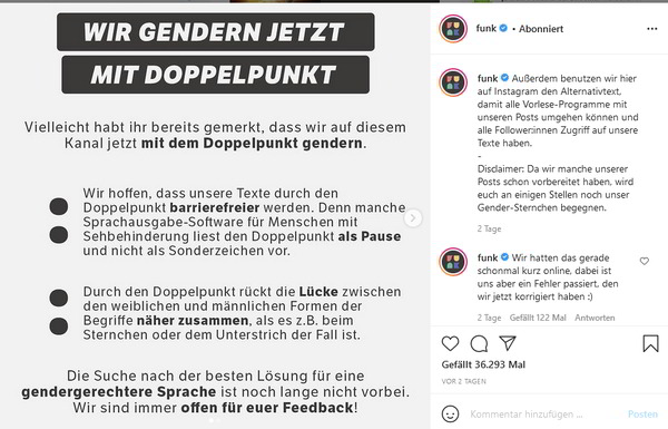 Momentan scheint sich eine Vorliebe für den Gender-Doppelpunkt heraus zu kristallisieren – ein Underdog unter den Genderzeichen. Zu den Medienaccounts, die den Gender-Doppelpunkt bei Instagram einsetzen, gehört beispielsweise Funk – das Content-Netzwerk von ARD und ZDF, bei dem über 70 Formate zusammen kommen.