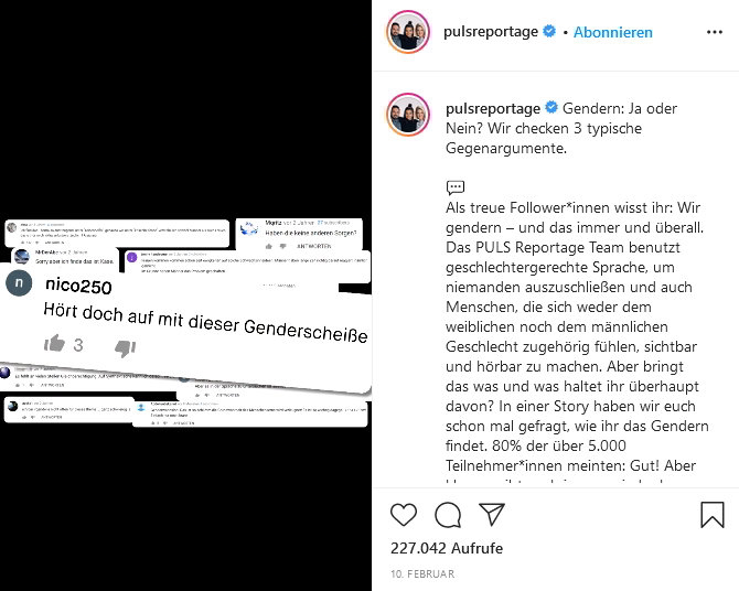 Auf Instagram wird allerdings auch mal Kritik am Sternchen laut. Selbstbewusst antwortet die Redaktion der Pulsreportage, das junge Angebot vom Bayrischen Rundfunk, wie dieser Fund vom 4.3.2021 zeigt. Sie präsentiert dort zugleich eine interessante Umfrage: