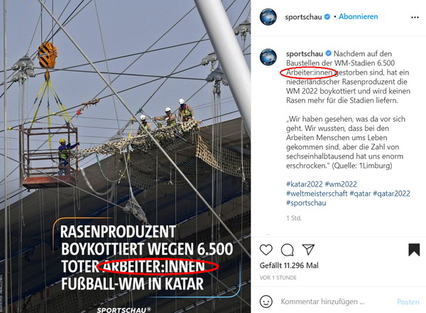 Die Sportschau der ARD, die älteste Sportsendung im deutschen Fernsehen, hat eine Durchschnittsreichweite von 4,8 Mio. Zuschauer*innen und ist damit das reichweitenstärkste Bundesligaformat. Der offizielle Instagram-Account der Sportschau wurde bisher fast 300.000 Mal abonniert. Hier findet sich am 12.3.2021 der Gender-Doppelpunkt: