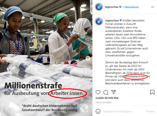 Auch die Tagesschau fährt diese Strategie. Ja, richtig gelesen! Die altehrwürdige Tagesschau präsentiert sich auf Instagram gendersensibel: Obwohl die Version fürs lineare Fernsehen auf sogenannte Genderzeichen und häufig auch auf die Beidnennung verzichtet, wird im Tagesschau-Kanal von Instagram der Gender-Doppelpunkt genutzt. Regelmäßig.