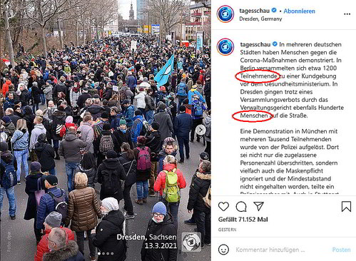In einem Tagesschau-Demobericht vom 15.3.2021 ist dort, wo üblicherweise beim vermeintlich generischen Maskulinum von „Teilnehmern“ und „Demonstranten“ die Rede gewesen wäre, nun von „Teilnehmenden“ und „Menschen“ zu lesen: